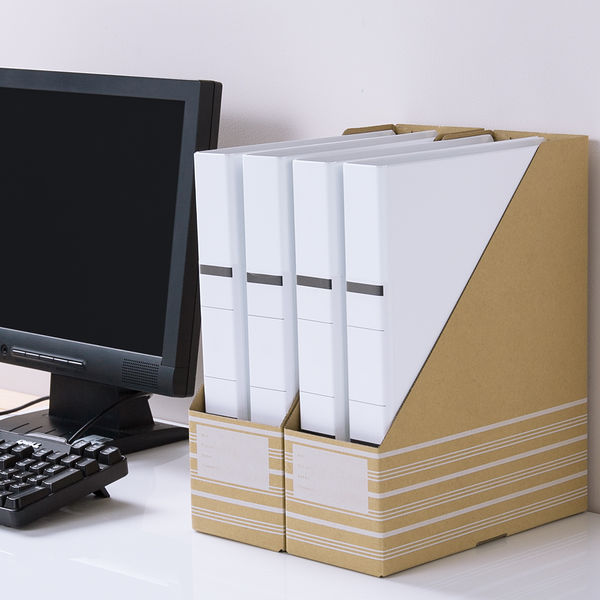 A4タテ型のボックスファイルです。収納幅は10.3cmで、前面にタイトルが書き込める仕様になっています。使わないときは畳んで収納できるため、オフィスの場所を余計にとる心配がありません。