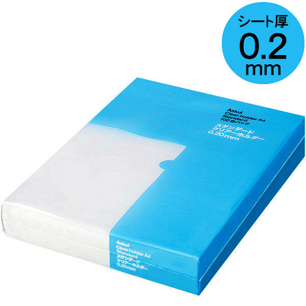 アスクルオリジナルのA4クリアーホルダー100枚セットです。0.2mmのしっかりした厚さで書類の保管はもちろんのこと、提出時や郵送時の書類の保護にも活用できます。