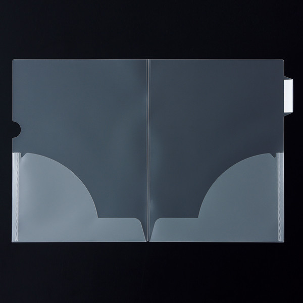 サイドに1山のインデックスが付いた2つ折りタイプのクリアーホルダーです。左右それぞれに書類を入れることはもちろん、2つ折りなのでA3サイズの書類の保管にもおすすめです。インデックス部分にはシルク印刷加工が施されており、油性ペンで文字を書くこともできます。