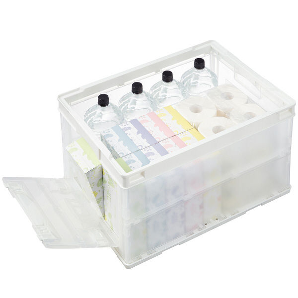 側面部分に扉がある折りたたみコンテナです。クリアタイプで収納物が見やすく、スタッキングした状態のまま中身を取り出せます。収納ボックスとしても使用できるオリコンは、容量が50L、許容内容物質量10kgとたっぷり収納できるのも魅力です。