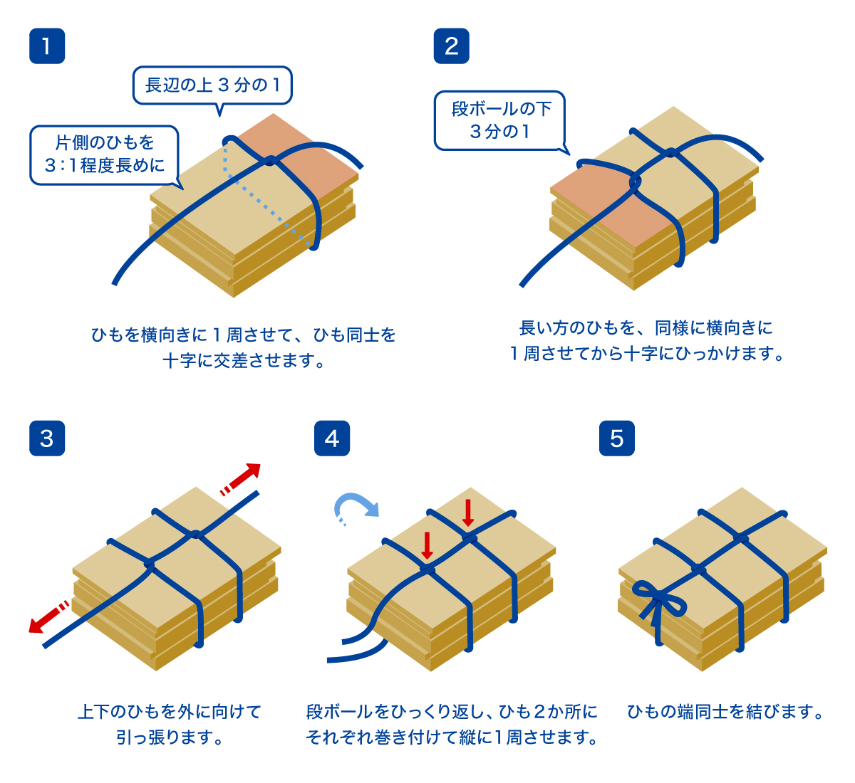十字縛りよりも、ひもが段ボールをしっかり支えるため、段ボールの大きさが異なっても崩れにくい点がメリットです。