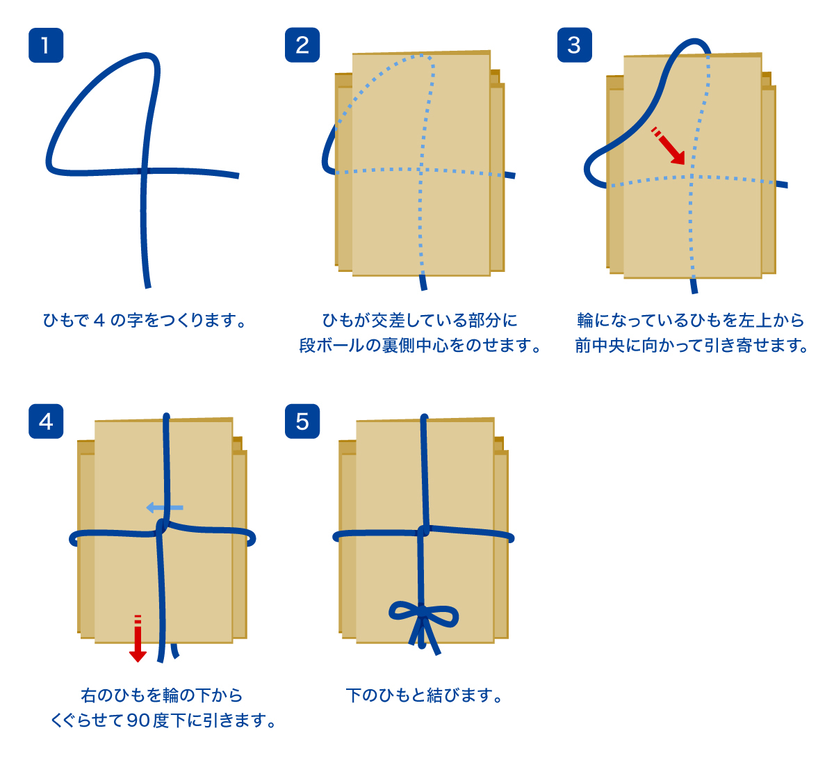 4の字縛りは、ひもを「4」の形になるように置いてから縛り、段ボールをまとめる方法です。縛った後の見た目は十字縛りと同じですが、段ボールを裏返さず簡単に縛れるため、ゆるみにくい点がメリットです。