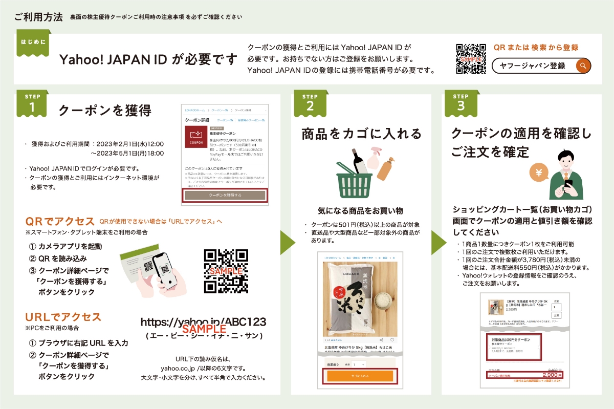 対象の株主さまへ以下のご案内を送付いたします。クーポンを適用した「LOHACO」のご利用方法については「クーポンご利用ガイド」 をご確認ください。なお、紙面デザインは予告なく変更される場合がございます。また、クーポンの獲得には同封の株主優待通知書および株主優待パスワード通知書が必要です。