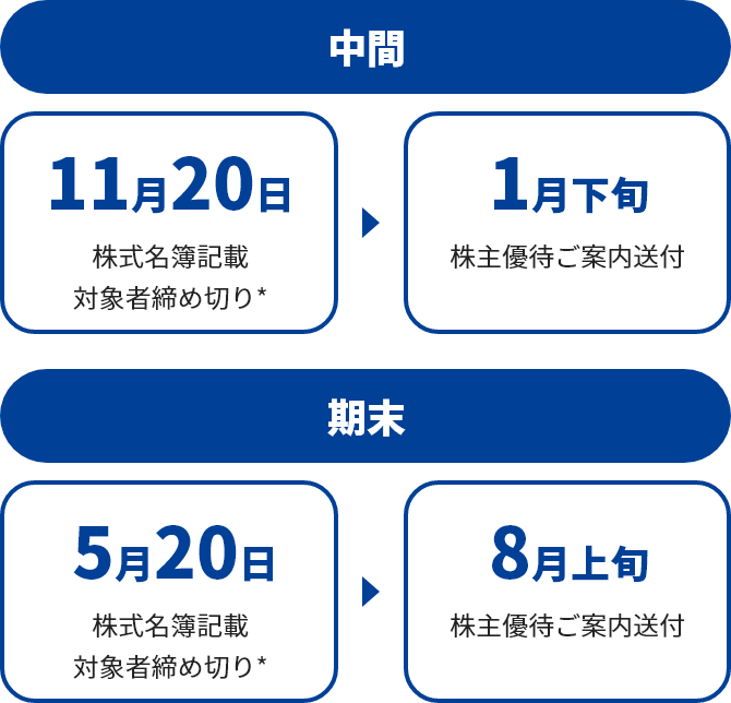 11月20日(中間)および5月20日(期末)の基準日時点において、株主名簿上で単元株(100株)以上を保有されている株主さまへ株主優待クーポンを進呈いたします。