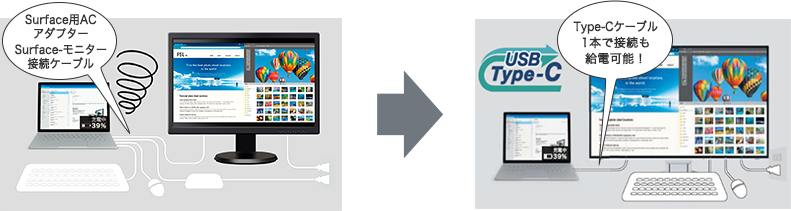 USBType-Cを搭載したSurfaceとEIZOのEV2785-SF/EV3285の組み合わせなら、映像表示や音声再生だけでなく、Surfaceへの給電もケーブル一本で可能!