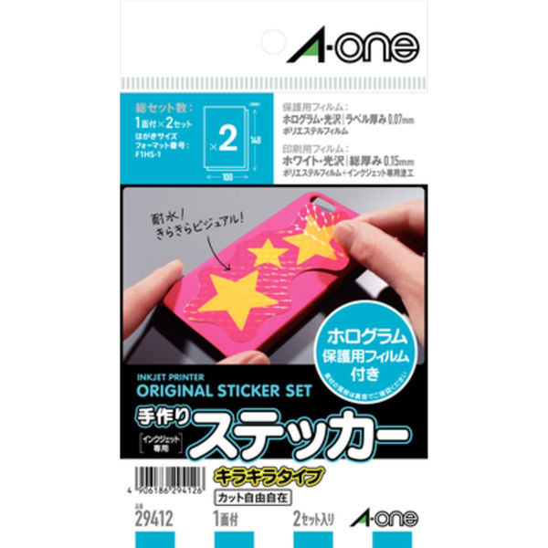 エーワン 手作りステッカー 耐水耐光 強粘着 インクジェット 光沢フィルム キラキラ はがきサイズ ノーカット1面 1袋(2セット入) 29412(取寄品)
