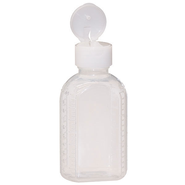 片手で開け閉めできるワンタッチキャップが付いた、刻印目盛の投薬瓶(水薬用)。