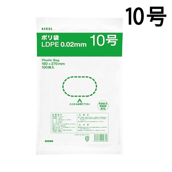 | 商品の特徴 | 【0.02mm厚】LDPE(低密度ポリエチレン)製のオリジナル透明ポリ袋です。薄手でも充分な丈夫さでダンゼン安い!LDPE製でツルツルとした質感の透明ビニール袋です。薄手だから、バッグシーラーで封をするのも簡単。物流での作業効率UP!食品を直接入れていただくことができ、肉や魚、青果、パン、お菓子などの梱包にオススメ!店舗での小分け袋や厨房、ご家庭のキッチンで便利にご使用いただけます。10号サイズは、布テープが1巻入る大きさです。たっぷり入ってお買い得な10000枚セット。アスクル限定・ロハコ限定 | ||