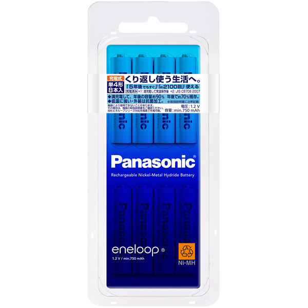 | 容量 | 単4形:min.750mAh | 電池寿命 | 約2100回くり返し使用可能 |
