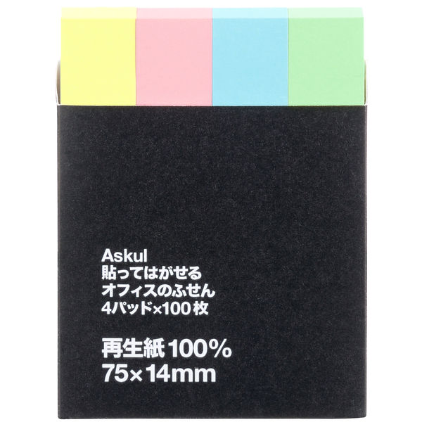 | 商品の特徴 | アスクルオリジナルの付箋(ふせん)。書いた文字が見やすいパステルカラーの4色アソート(イエロー、ピンク、ブルー、グリーン)。75×14mmのスリムタイプで、目印やインデックスにおすすめ。のり残りが少なく、紙類におすすめ。100%再生紙を使用して環境にも配慮しています。アスクル限定・ロハコ限定 | ||