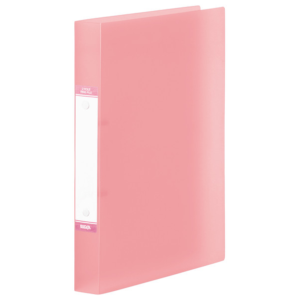 A4サイズのコピー用紙を約200枚収容できるハピラ(スガタ)の丸型2穴リングファイル。表紙はきれいな半透明カラーの樹脂製(PP製)。背幅3.5センチ。