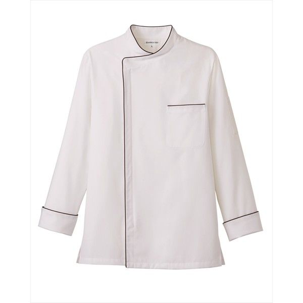 | 商品の特徴 | 汎用性の高いコックコートをボタンレスにして、カラーパイピングでモダンに仕上げました。シンプルだから、様々なショップにマッチします。見た目はコックことらしさはそのままに、着脱性に便利なジップ仕立て。左腕に便利でお洒落なペン差しを装備しています。●男女兼用のSS、Sサイズはレディス用、Mサイズ以上はメンズ用。 | ||