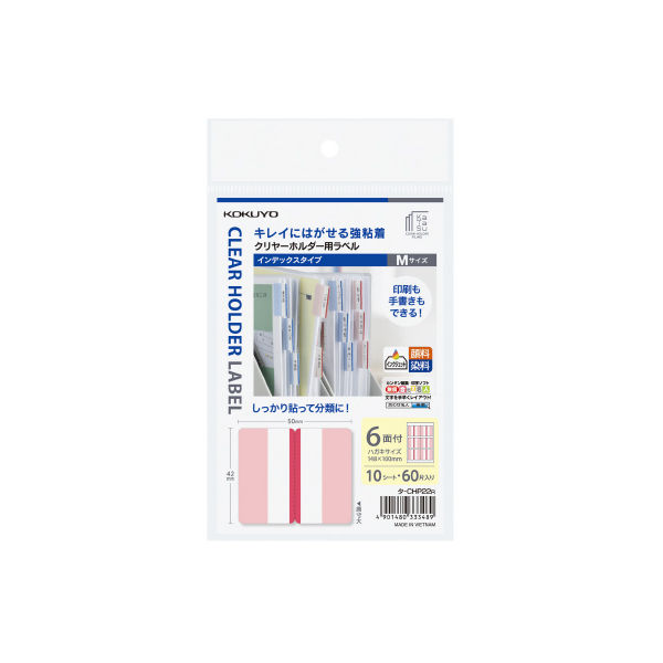 | 商品の特徴 | ●クリヤーホルダーに最適な粘着剤を採用していますので、クリヤーホルダーにしっかり貼れて、表示をはがす時はキレイにはがせます。●サッと貼って目印にできるふせんタイプと、しっかり貼って分類に便利なインデックスタイプをご用意しています。●全面のりでしっかり貼れるインデックスタイプ。表示部分には枠がないので、見出しとなる文字を大きく、たくさん入れることができ、検索性向上に役立ちます。折り返し部分にも色付きで、立てて管理する場合の識別に便利です。●手書きだけでなく、プリンタ印刷にも対応。多枚数の作成にも便利です。 | ||