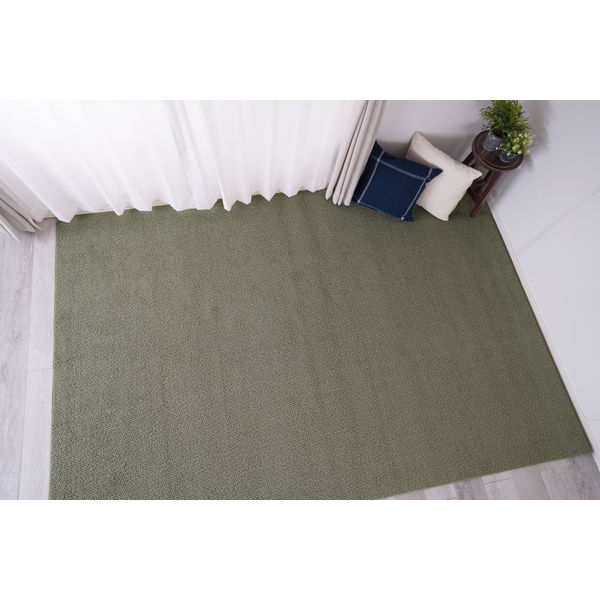 | その他商品仕様 | ●商品:オーダーラグ●サイズオーダー:5cm単位で選択できますが、生地の特性や湿度等の影響により、仕上がりサイズに±1%の誤差が生じます。 丸巻きの状態でお届けしますので、敷き初めは若干サイズが小さい場合がございますが、いずれ戻っていきます。●防ダニ:インテリアファブリックス性能評価協議会の基準に合格した防ダニ加工。ダニを寄せ付けない忌避効果を高め、持続性に優れた安全性の高い防ダニ加工。 ●アレルブロック:ダニのフンや死骸さらにスギ花粉アレルゲンを吸着することで、安心・快適・クリーンな室内環境を作ります。●防音:室内の騒音を遮音する効果に優れた製品。JISの基準より△LL(I)-6(旧呼称LL-35)は床衝撃音低減性能等級をあらわし階下に音が響くのを和らげる優れた性能であることを示します。●床暖・ホットカーペット対応:耐熱加工をし、ホットカーペットや床暖房の熱に強い製品です。カバーとしてご使用になる際は、ホットカーペット、床暖房メーカーの取扱説明書に従ってください。●F☆☆☆☆: インテリアファブリックス性能評価協議会が定めた自主基準によるVOC(ホルムアルデヒド)放散の等級区分を表示した統一マーク。F☆☆☆☆は最上級の性能です。●遊び毛防止:フィラメント(長繊維)を使用しているので、遊び毛や抜け毛、毛玉の発生が非常に少ない製品です。 | カラー | グリーン |