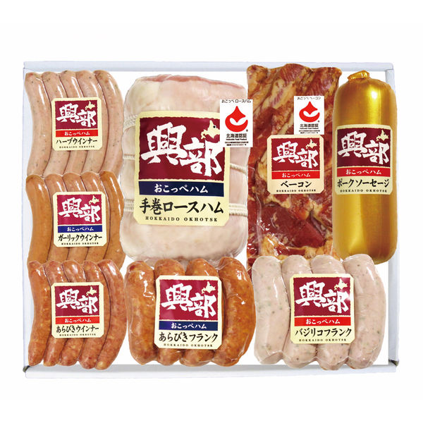 - 北海道認証手巻きロースハム/700g、北海道認証ベーコンブロック・ポークソーセージ/各300g、あらびきウインナー・ガーリックウインナー/各110g、ハーブウインナー/135g、あらびきフランク/200g、バジリコフランク/240g