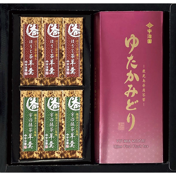 | 商品の特徴 | 独特な旨味と香りの緑茶、鹿児島県産ゆたかみどりと自社の茶葉を練りこんだ抹茶・ほうじ茶味の羊羹との詰合せです。 | ||