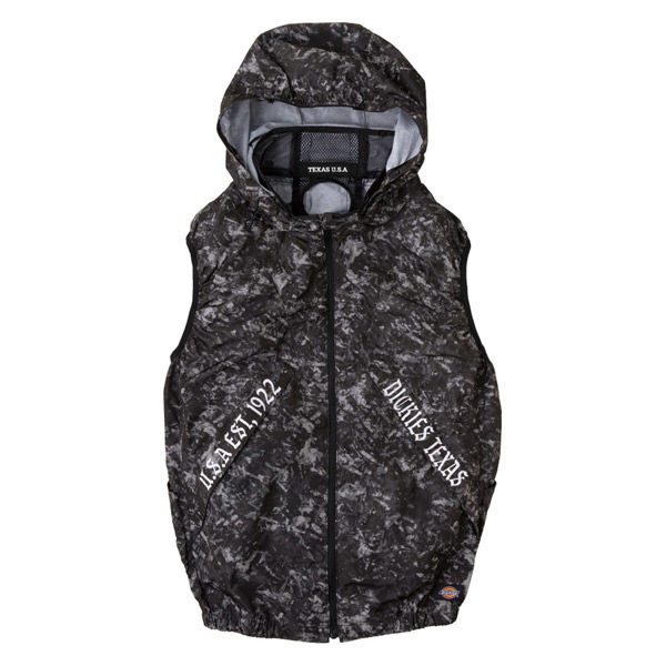 ペルチェクーラーと空調ファンを取り付けて暑さから身体を守るDickies空調ウェア。フェイクメモリ素材を使用し、ファンの位置を脇側に移動させたニアサイドファン仕様。