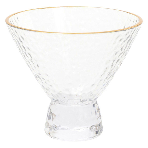 | 商品の特徴 | ハンマーで凹凸加工したような表面感と、金縁で高級感のあるグラス。アイスやかき氷、フルーツなどのデザートの盛り付けにぴったり。小物入れとしてお使いいただくのもおすすめ。■容量:250ml■食洗機:不可■電子レンジ・オーブン・IH・直火:不可【ガラス】【デザート皿】【アクセサリートレーとしても】 | ||