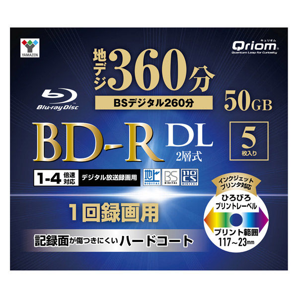 YAMAZEN BDーR 2層式 1回録画 50GB 地デジ360分 4倍速 スリムケース 5枚 BD-R5DLC 1個
