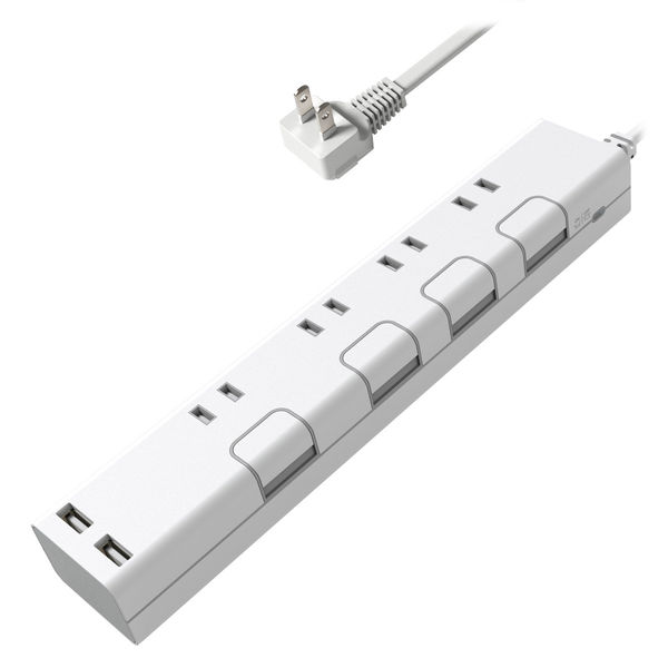 | 商品の特徴 | 2m延長コードタイプのUSB充電ポート付の2ピン式コンセントタップ(OAタップ)。ACコンセント4個口(合計1400W)、USBーAポート2個口(最大出力2.4A)。隣の挿し込み口に干渉しないACアダプタ用挿し込み口。接続された機器を自動判別、機器に合わせて最適充電。個別スイッチで節電。壁に収まるL字プラグでスペース節約。トラッキング防止プラグ採用。埃を防ぐシャッター付きコンセントとUSBポート用キャップ。接続機器を守る雷ガード。火災や感電防止に有効な二重被ふくコード。SIAA抗菌加工仕様。 | ||