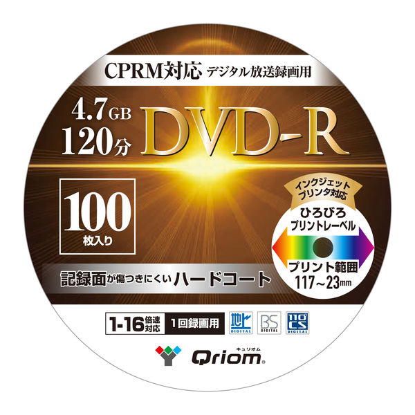 CPRM対応・高画質デジタル放送録画用。4.7GB(120分)/16倍速/1回録画用。記録面が傷つきにくい加工。インクジェットプリンタ対応(印刷範囲117~23mm)。