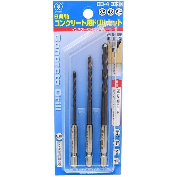 | 商品の特徴 | コンクリート、ブロック、モルタル、石ボードの穴あけ用。セット内容:3.5mm・4.8mm・6.4mm。適応機種:電気ドリルインパクトドライバー(9.6V以上)ドリルドライバー(9.6V以上)振動ドライバー。回転・振動兼用型。 | ||
