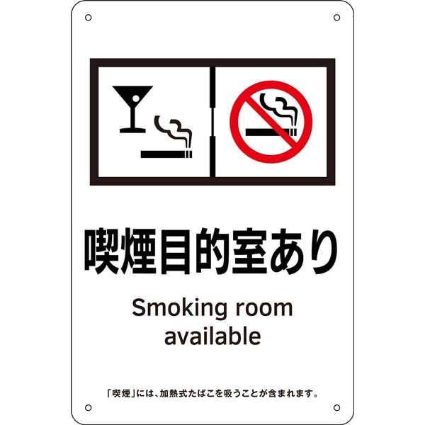 | 商品の特徴 | ●2020年4月1日健康増進法の一部改正する法令が全面施行され、同改正健康増進法に準拠した喫煙室用の標識です。●多数の者が利用する施設等の区分に応じ、喫煙が可能な施設に対して、どのような喫煙設備を設置しているかについて説明する標識の掲示が義務付けられました。●改正法では、喫煙が可能な施設に対して、どのような喫煙設備を設置しているかについて説明する標識の掲示が定められています。(16種類) | ||