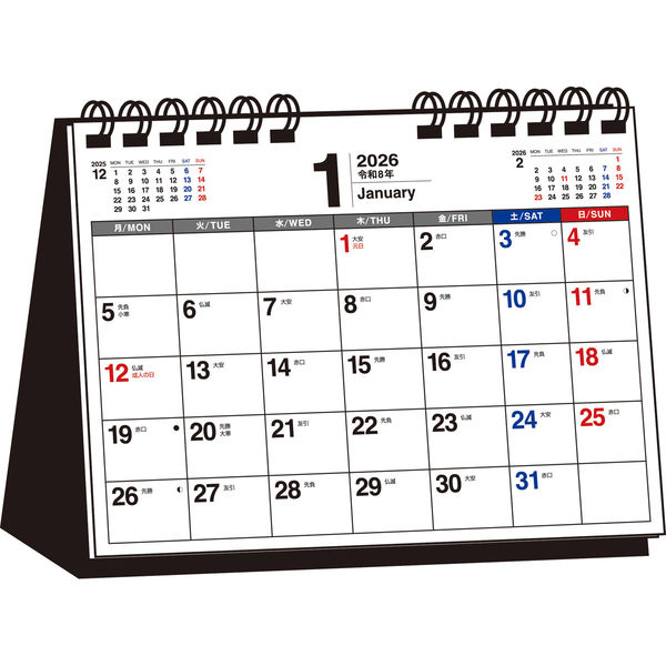 | 商品の特徴 | B6ヨコサイズの月曜始まりカレンダーです。5週タイプ。3色印刷(裏面は2色の横書き)。六曜・二十四節気・月相入り。本年・翌年の年間カレンダー付き。(B6ヨコ/表3色+裏2色/ヨコ/タテ134×ヨコ182ミリ)【2026年カレンダー・スケジュール帳】 | ||