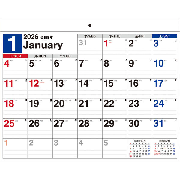 | 商品の特徴 | フラットで書き込みやすいリングレスB4ヨコカレンダーです。6週タイプ。3色印刷。六曜、二十四節気、月の満ち欠け入り。翌年の年間カレンダー付き。(B4ヨコ/3色/タテ287×ヨコ363ミリ)【2026年カレンダー・スケジュール帳】 | ||