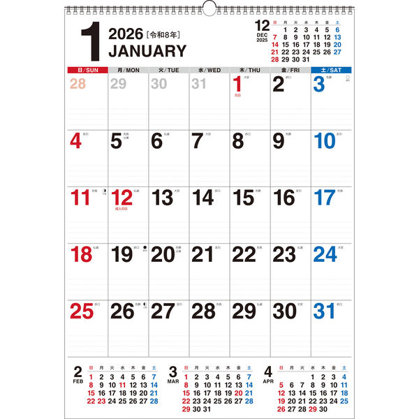 | 商品の特徴 | 4ヵ月がパッと確認できる大判カレンダーです。5週6週混合タイプ。3色印刷。六曜、二十四節気、月相入り。翌年の年間カレンダー付き。(A2タテ/3色/タテ594×ヨコ420ミリ)【2026年カレンダー・スケジュール帳】 | ||