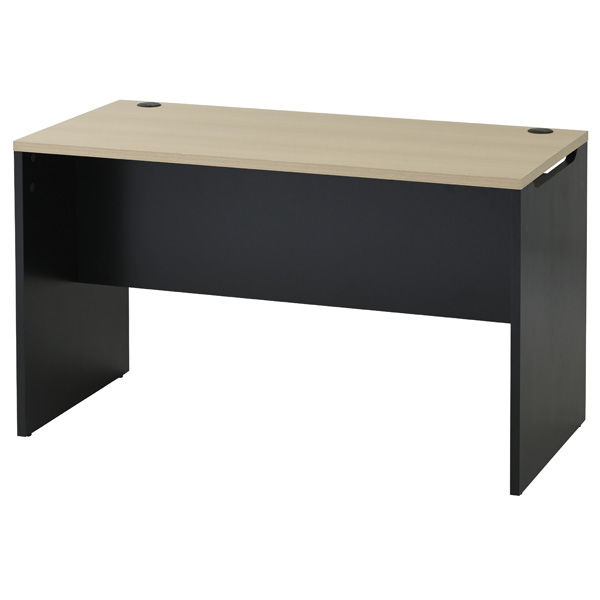 天板厚24mm、耐荷重100kgの木製デスク。側・背板は落ち着いた雰囲気のブラック。天板に電源コードを通せる配線穴(2か所)付き。側板の切り欠きからもコードを通せる。