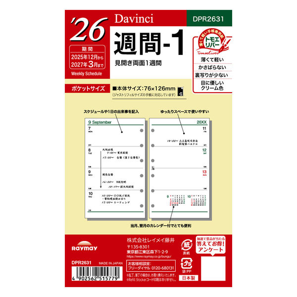 【アウトレット】【2026年度版手帳】レイメイ藤井 ダ・ヴィンチ ポケット週間ー1 DPR2631 1個