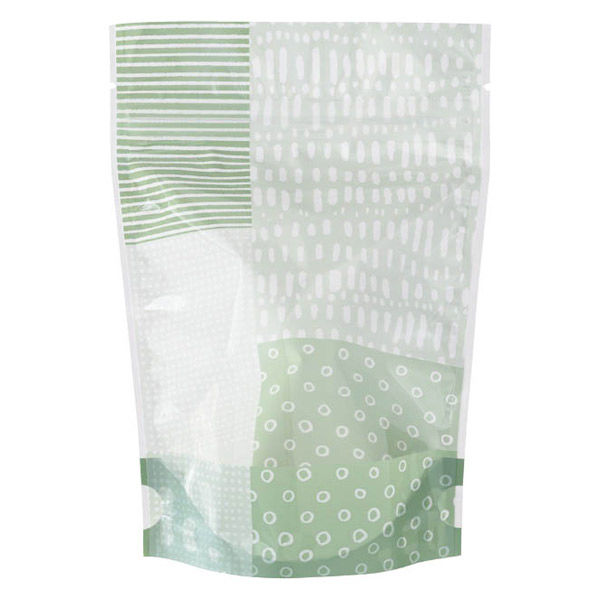 | 商品の特徴 | 緑色の和モダン柄のジップ付きの乾燥剤対応スタンドバッグです。おかきやあられなどを入れてお使いいただくのにぴったりな商品です。 | ||
