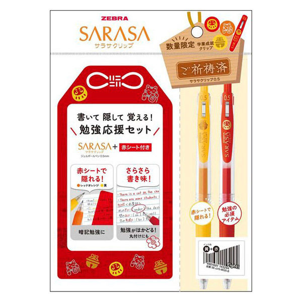 | 商品の特徴 | 神社の学業成就のご祈祷済み!頑張る受験生のお守りになります。サラサクリップ2本と赤色のチェックシート(コンサイスサイズ)1枚の暗記セット。サラサクリップのクリップ部分に縁起の良いモチーフがワンポイントでデザインされています。赤シートで隠せるオレンジ系インク。 | ||