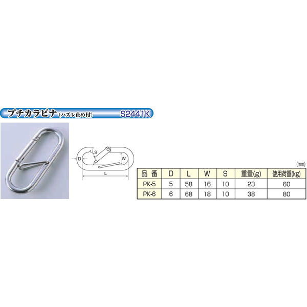 | 商品の特徴 | SUS304ステンレス製のプチカラビナ(ハズレ止め付)です。ハズレ止め機能により、鍵や小物が不用意に外れる心配がありません。錆びに強く耐久性も高いため、長期間安心して使用可能。軽量で扱いやすく、結束や固定に便利な実用的アイテムです。 | ||