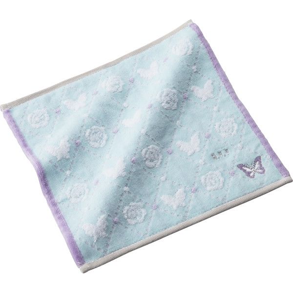 婦人向けタオルハンカチです。蝶と薔薇の刺繍が小ぶりで使いやすいです。無撚糸を使用しております。