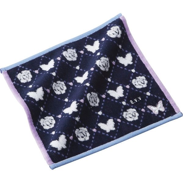 | 商品の特徴 | 婦人向けタオルハンカチです。蝶と薔薇の刺繍が小ぶりで使いやすいです。無撚糸を使用しております。 | ||