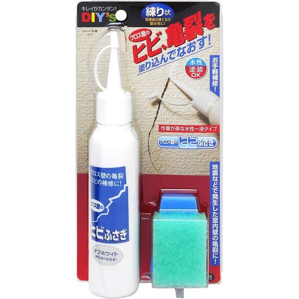 クロス壁のヒビ、亀裂の隙間に塗り込んで直します。扱いやすいノズル式ボトル、ヘラやスポンジ付きです。