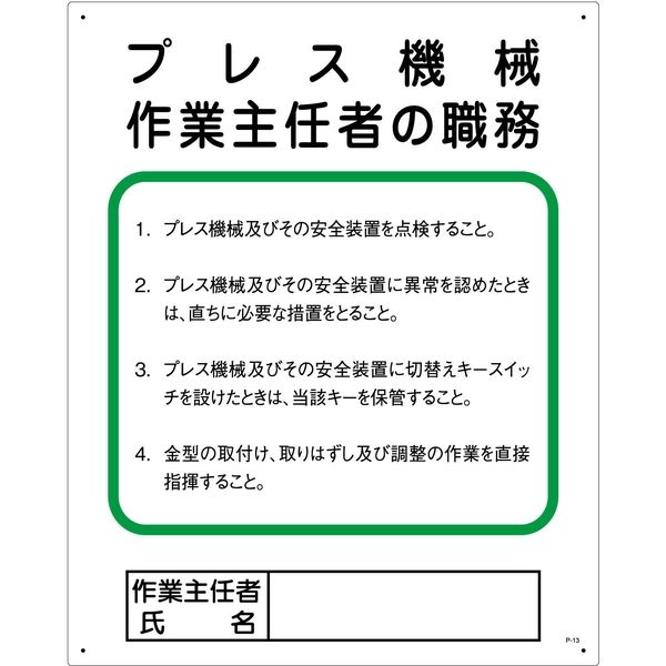 本商品:グリーンクロス 作業主任者の職務標識 P-13 プレス機械作業主任者の職務 1145110113 1枚