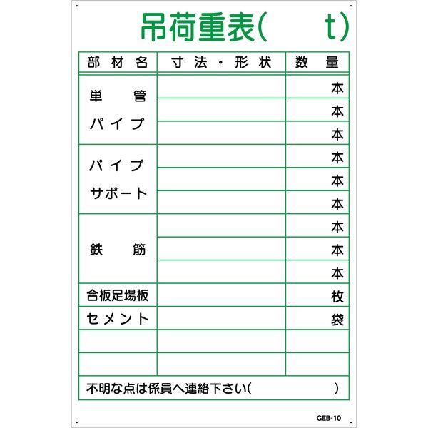 グリーンクロス マンガ標識 GEB-10 吊荷重表 1145170810 1枚(直送品)
