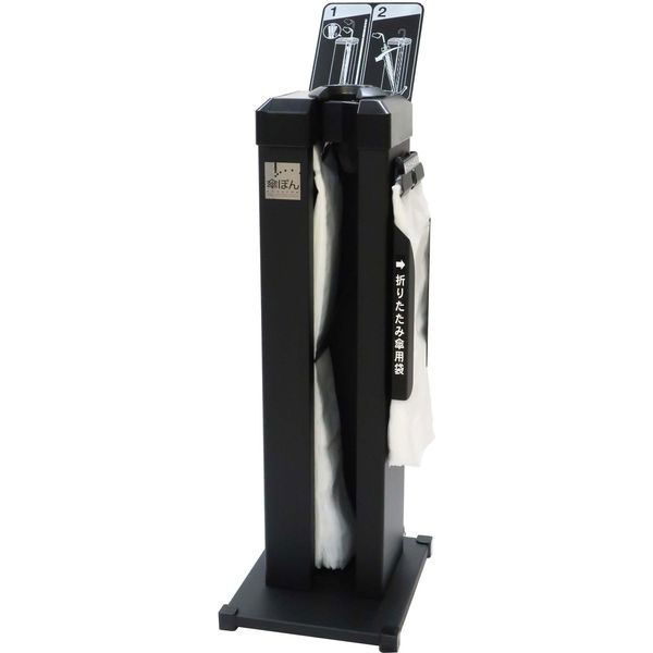 | 商品の特徴 | 狭い場所にも設置が可能なスリムボディ。スタンダードタイプ(KP-96)に比べ、底板幅を約5cmスリム化した傘ぽんの、プレミアムなブラック仕様です。省スペースで小型店舗にも設置可能です。 | ||