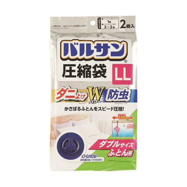 - ●防虫・殺虫でおなじみ「効き目のバルサン」シリーズから圧縮袋が登場しました。●ダニよけ成分に加えて防虫成分も配合し、ダニだけではなく、イガ・カツオブシムシなどの害虫からも布団を守ります。●アレルギーの原因ともなるダニはもちろん、大切な布団の繊維を食べてしまう害虫にも効果があります。●ダニよけ・防虫成分は圧縮袋の内側に練り込んでいるので、外に漏れず内側だけに徐々に蒸散していきます。●海外製凸型ノズルにも対応したオートバルブで、スピード吸引を実現しています。●閉じると色が変わるカラーファスナーを採用し、閉じ忘れを防ぎます。●ファスナーを閉めるスライダーは取り付け済みなので、紛失もしづらいです。●収納物の目安…ダブルサイズ掛け布団なら4つ折りで1枚、ダブルサイズ毛布なら2~3枚、シングル布団(掛け・敷きセット)なら1組●ふとん圧縮袋