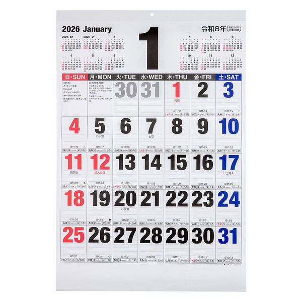 | 商品の特徴 | 【在庫処分】元号、六曜、節気、雑説、行事、朔望、十干、十二支、九星、旧暦、三隣亡あり。壁掛けカレンダーはリング金具を使用せずリサイクル可能な仕様になっております。FSC®認証製品。環境保全に寄与しています。【2026年カレンダー・スケジュール帳】、【26calendarbungu】 | ||