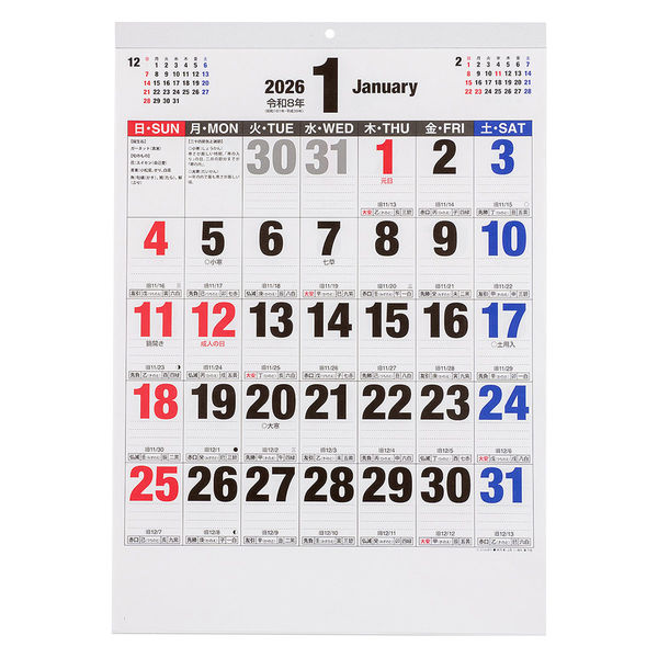 商品の特徴 【在庫処分】元号、六曜、節気、雑説、行事、朔望、十干、十二支、九星、旧暦、三隣亡あり。壁掛けカレンダーはリング金具を使用せずリサイクル可能な仕様になっております。FSC®認証製品。環境保全に寄与しています。【2026年カレンダー・スケジュール帳】、【26calendarbungu】