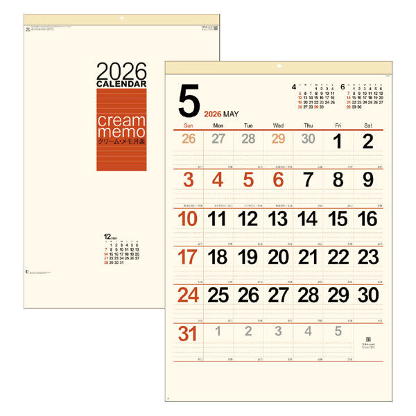 本商品:【アウトレット】【2026年度版カレンダー】新日本カレンダー クリーム・メモ月表(ジャンボ) KC8148 1冊