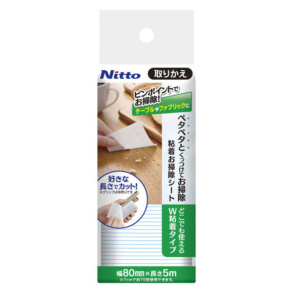 | 特徴 | ピンポイントでどこでも簡単にお掃除できる粘着シートです。好きな長さにカットして、狭い場所の清掃や少量のゴミなど、気になった箇所をピンポイントでペタペタとお掃除できます。 | 幅 | テープ80mm幅 |