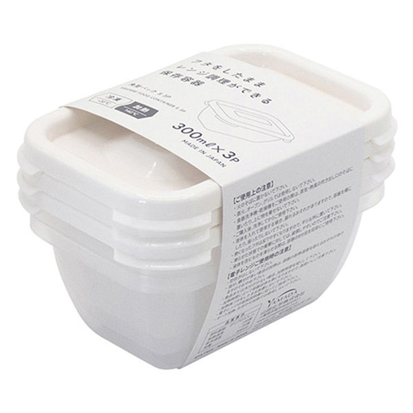 | 商品の特徴 | フタをしたまま電子レンジ加熱できる保存容器の3個セット。1個あたり約300mL、約130×89×高さ53mm。作り置きや小分け保存に便利。 | ||