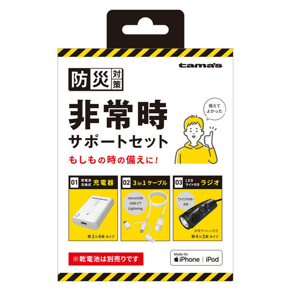| 商品の特徴 | 乾電池式スマートフォン充電器+3in1ケーブル+LEDライト付きラジオを1セットにした非常時セット。災害・停電時に情報源を確保する。 | ||