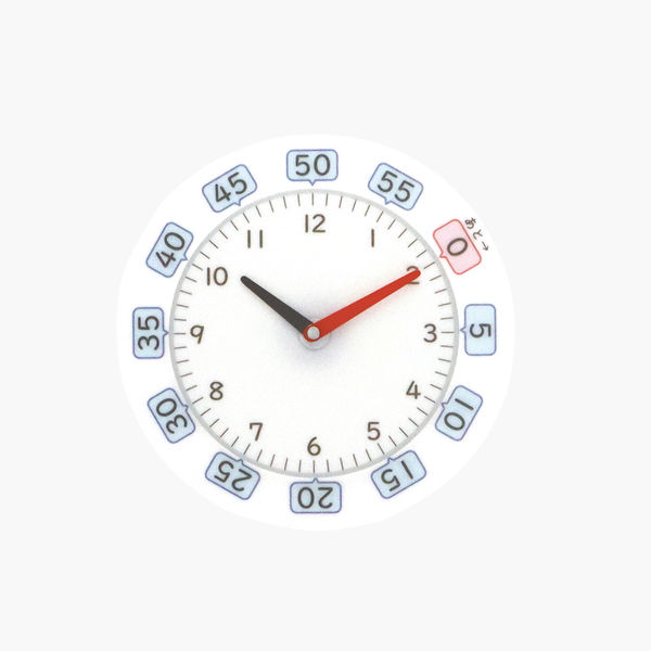 | 商品の特徴 | 【使い方例】STEP1 例えば「10時10分の35分後は何時何分?」という問題の場合、まず長針の位置にボードの赤い「0」を合わせます。STEP2 「0」から「5、10、15……」と数えて、ボードの「35」まで針を動かすことで、答えが10時45分だということが分かります。STEP3 ボードを裏返すと「〇分前」を読み取るために使えます。長針を「0」に合わせると、あと「〇分」が表示される※時計模型の針は連動しません。 | ||