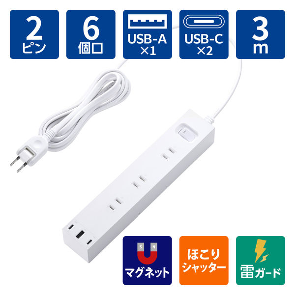 エレコム USBタップ 延長コード 3m コンセント 6口 USBーC×2 A×1 白 ECT-3930WH 1個